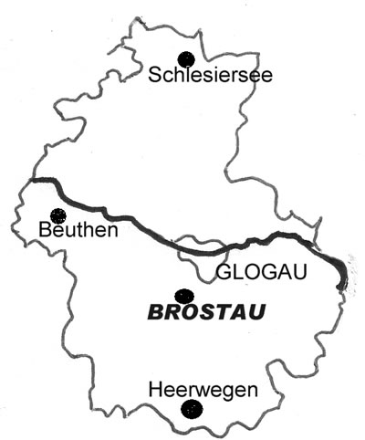 Brostau war vor dem Krieg ein gepflegtes Bauerndorf, etwa 2 km oderaufwärts von Glogau entfernt, mit 1040 Einwohnern (1936), einer kath. und ev. Kirche. Außer einer Ziegelei gab es keine größeren gewerblichen Anlagen. Von den 75 Grundstücksnummern waren 43 Bauernhöfe, die entlang der „Hauptstraße" aufgereiht standen. Die Nähe zu Glogau hatte auch Nachteile. Brostau musste wertvolles Ackerland an die immer größer werdende Stadt abgeben, was zur Folge hatte, dass die Anzahl der Bauern in Brostau zurückging. Nach dem Krieg wurde Brostau 1985 eingemeindet und ist heute ein „Stadtteil" von Glogau.